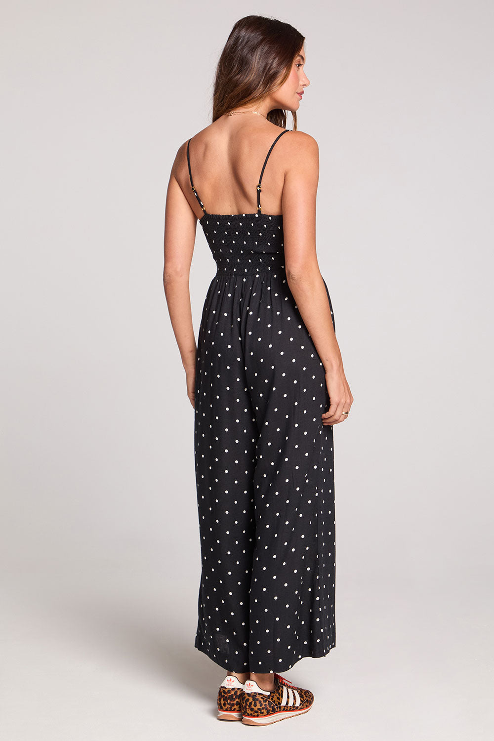 The playful dot pattern adds personality while the jumpsuit silhouette delivers instant sophistication.